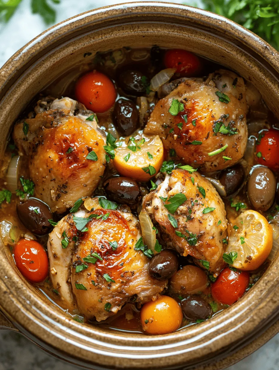 4. Layer the Ingredients in the Crockpot: In your crockpot, start with a layer of the sautéed onions and garlic (if using), followed by the seasoned chicken thighs. Pour the lemon juice over the chicken, ensuring it’s evenly distributed. Add the cherry tomatoes and Kalamata olives, layering them on top of the chicken.