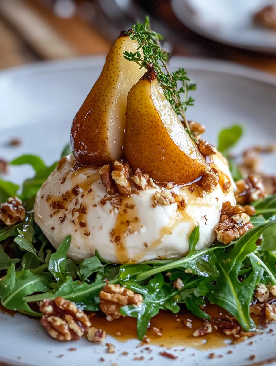 Burrata cheese is the perfect counterpart to the sweet, caramelized pears. This Italian cheese is known for its unique texture, consisting of a soft outer layer made from mozzarella and a creamy, rich center filled with stracciatella and cream. When paired with the warm caramelized pears, the burrata provides a luxurious, creamy element that contrasts beautifully with the sweetness of the fruit.