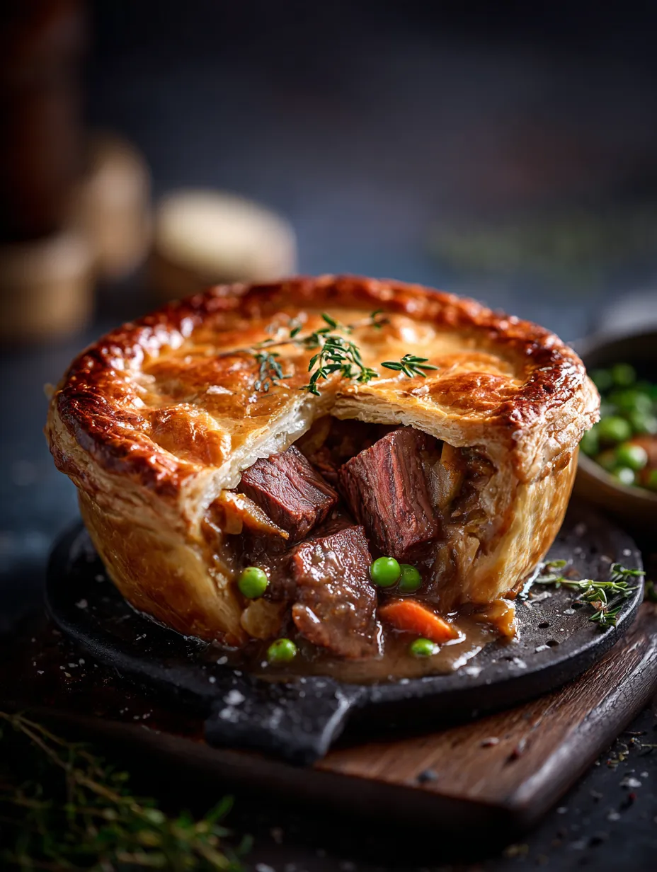 The pie features a rich filling made from tender beef, simmered slowly in a flavorful combination of stout beer and aromatic vegetables. The addition of herbs and spices enhances the taste, resulting in a dish that is bursting with flavor. Topped with a flaky, buttery puff pastry crust, this rustic pie is the epitome of comfort food, perfect for chilly evenings or special gatherings.