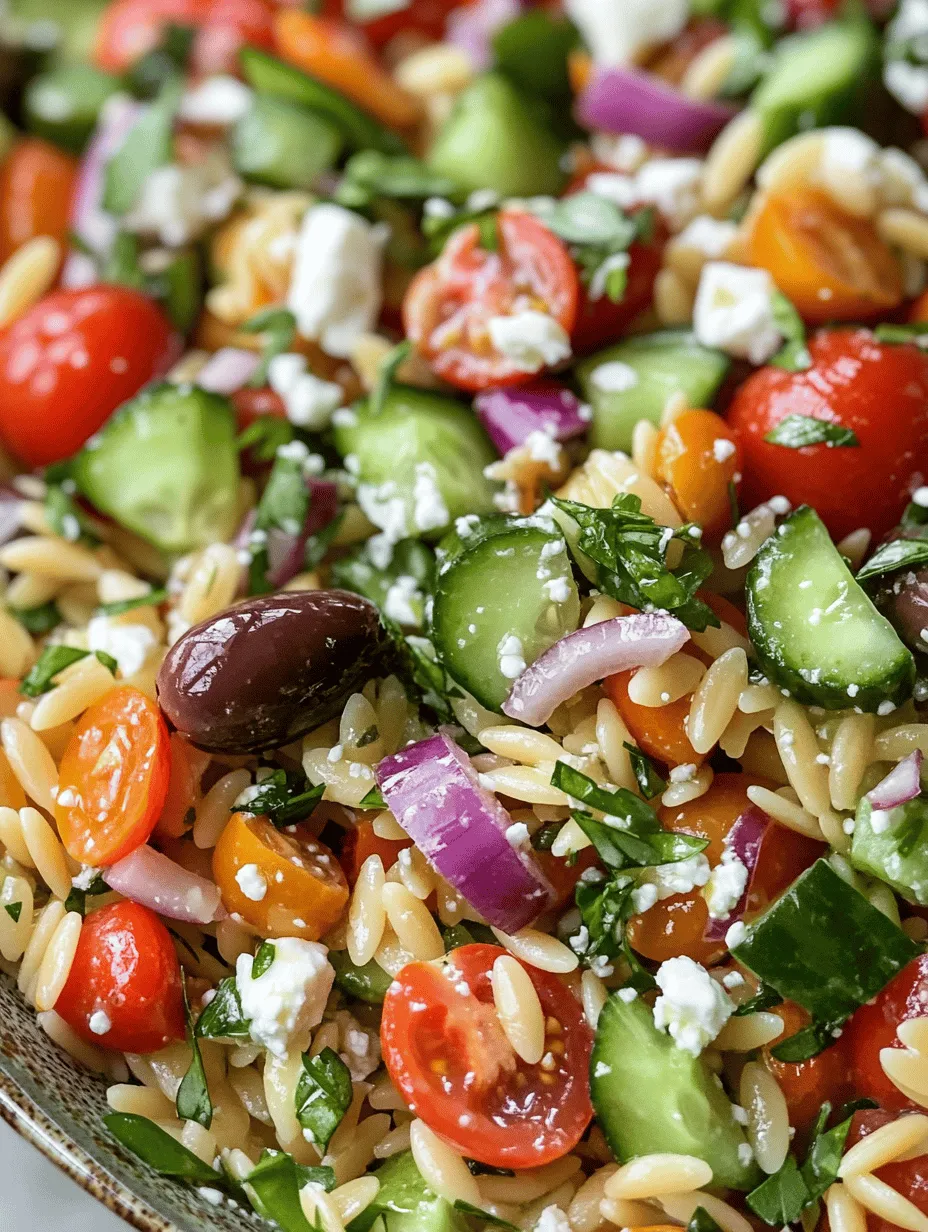 Orzo pasta serves as the foundation of this salad. With a nutritional profile that includes carbohydrates for energy, protein for muscle building, and essential vitamins and minerals, orzo is a healthy choice for any meal. It’s also easy to cook—simply boil in salted water until al dente. To achieve the perfect texture, it’s important to monitor the cooking time, typically around 8-10 minutes. After cooking, rinse the orzo under cold water to stop the cooking process and cool it down, which helps to prevent clumping.