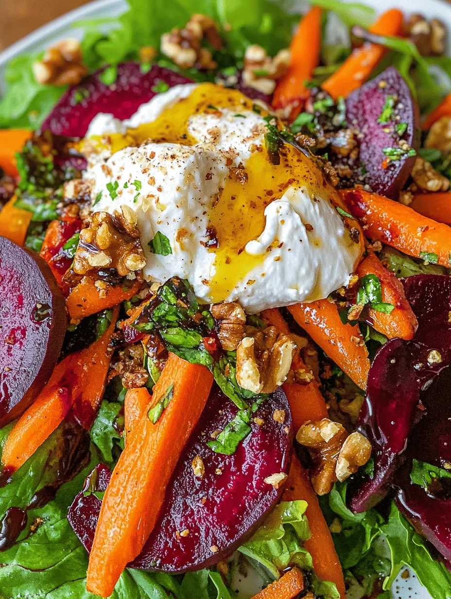 Serving the roasted roots while they’re still warm is essential for the overall experience of this salad. The warmth of the vegetables gently melts the creamy burrata, creating a luxurious texture that enhances every bite. This contrast between warm and cool, crispy and creamy, makes for a delightful culinary experience.