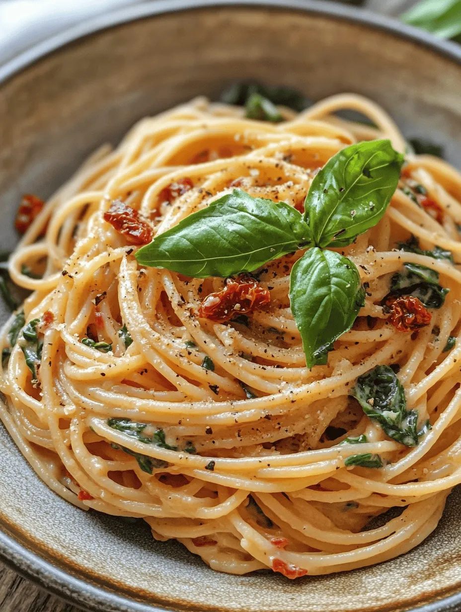 Sun-dried tomatoes, on the other hand, are a flavor powerhouse. Dried at the peak of ripeness, they concentrate the natural sweetness and acidity of fresh tomatoes. This results in a bold flavor that can elevate any dish. In this recipe, sun-dried tomatoes not only provide a delightful tang but also add a lovely texture that contrasts with the creaminess of the sauce. Together, spinach and sun-dried tomatoes create a perfect balance in this spaghetti dish, ensuring every bite is packed with flavor and nutrition.